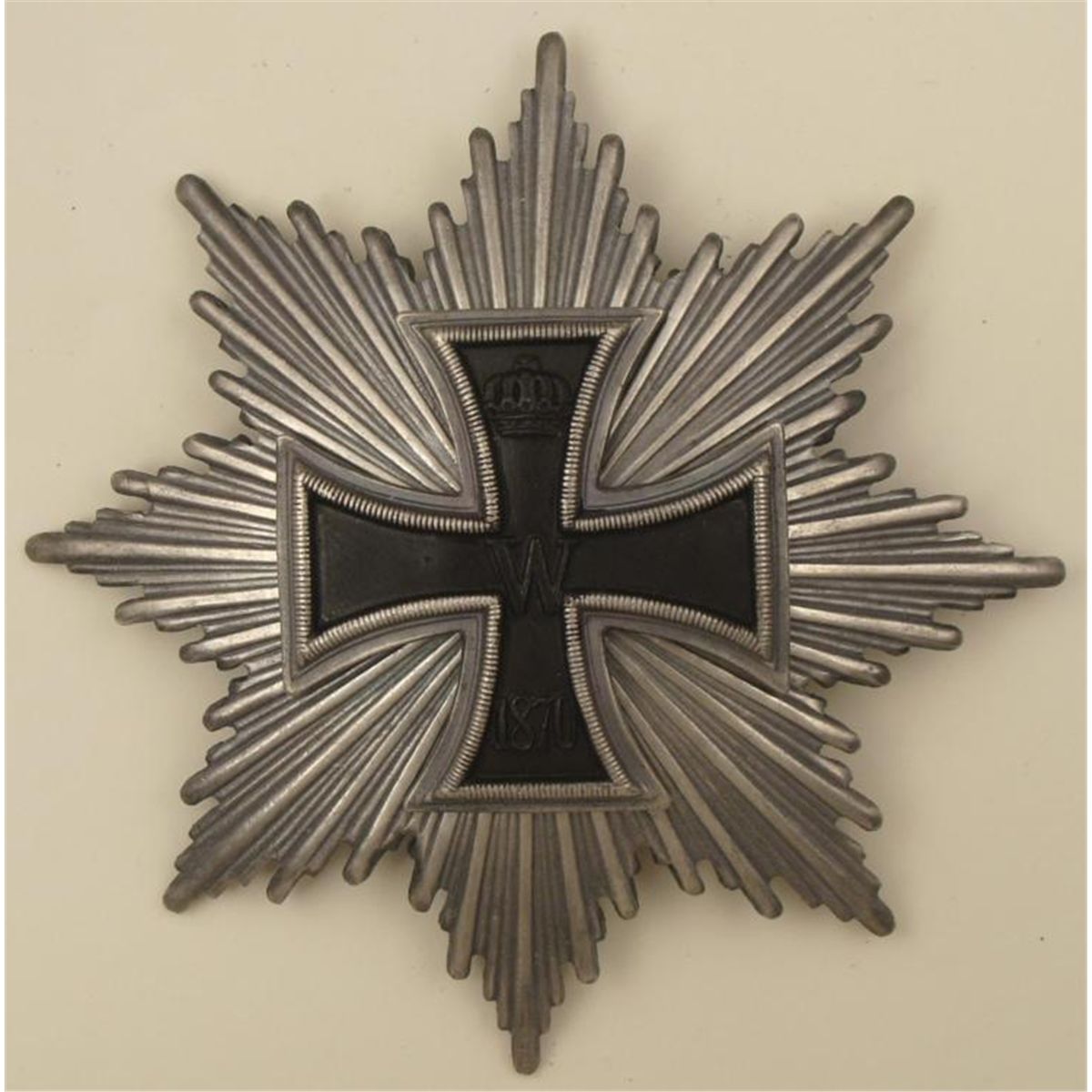 ORDER OF THE IRON CROSS-1914-THE HINDENBURG STAR-OUTSTANDING MUSEUM COPY * PAUL VON HINDENBURG WAS THE ONLY RECIPIENT OF THIS AWARD- 3 1/2" IN WIDTH-HAS IRON CROSS CENTER-WITH 1870-"W" AND CROWN- NICELY DETAILED STARBURST-REVERSE PIN SEEMS TO BE MARKED "DESCHLER & SOHN"--GREAT LOOKING MUSEUM DISPLAY COPY *