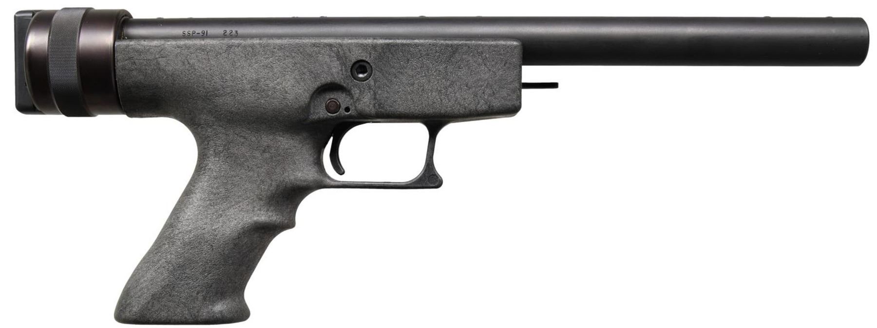 MATCHING BOX. Cal. 223. S# VAP001. Bbl. 14". Model SSP-91 single shot breechloading pistol mfg. by Ordnance Tech. in Stetson, ME. Left side of bbl. is marked "MFG. BY ORDNANCE TECH., INC., STETSON, ME" followed by "FOR MAGNUM RESEARCH MINNEAPOLIS, MN", with the model and cal. designations marked on the right. Metal components exhibit a matte gray finish. Gray plastic thumb rest stock. UNATTACHED ACCESSORIES: matching factory box. CONDITION: near new, with metal components retaining bountiful amounts of their original factory finish overall. Mirror bore, exhibiting well defined rifling throughout. Plastic stock is excellent overall. Box exhibits mild wear, but otherwise remains sturdy and serviceable. PROVENANCE: From the Working Reference Collection of Military Arms Instructor, Master Sergeant Vincent Pestilli. (23-7523/MLW). MODERN. $300-500.