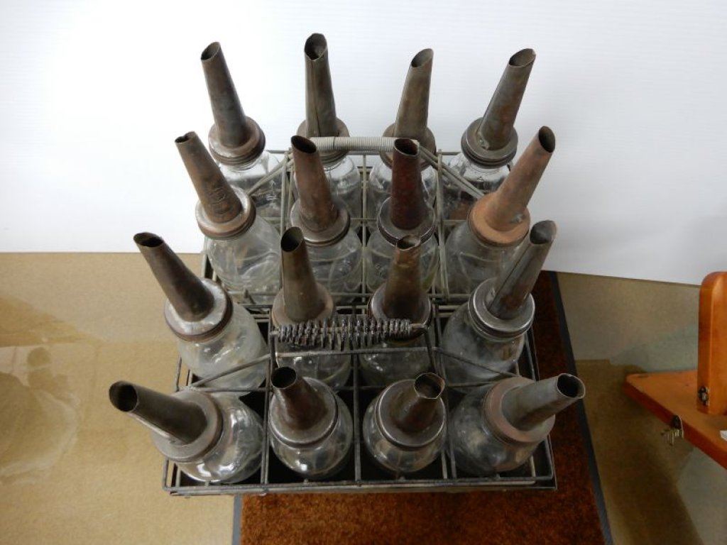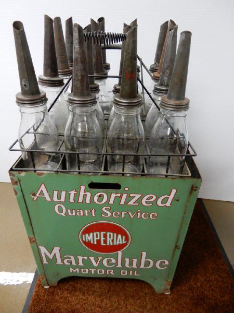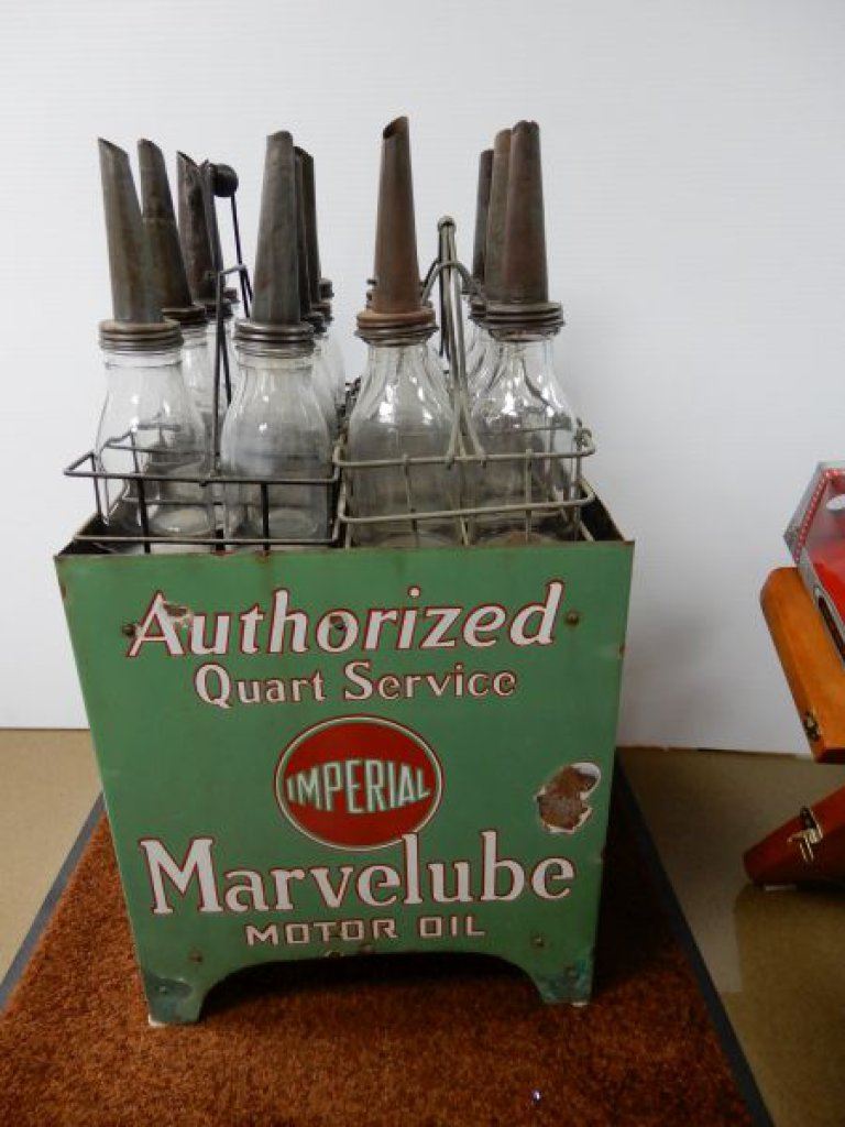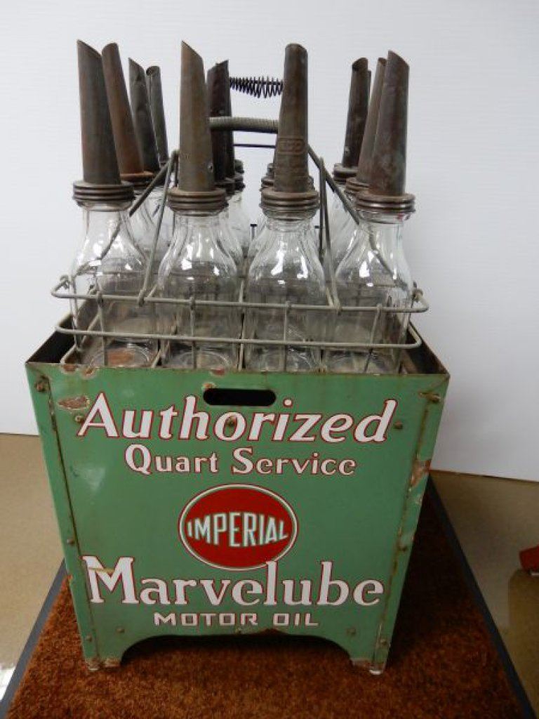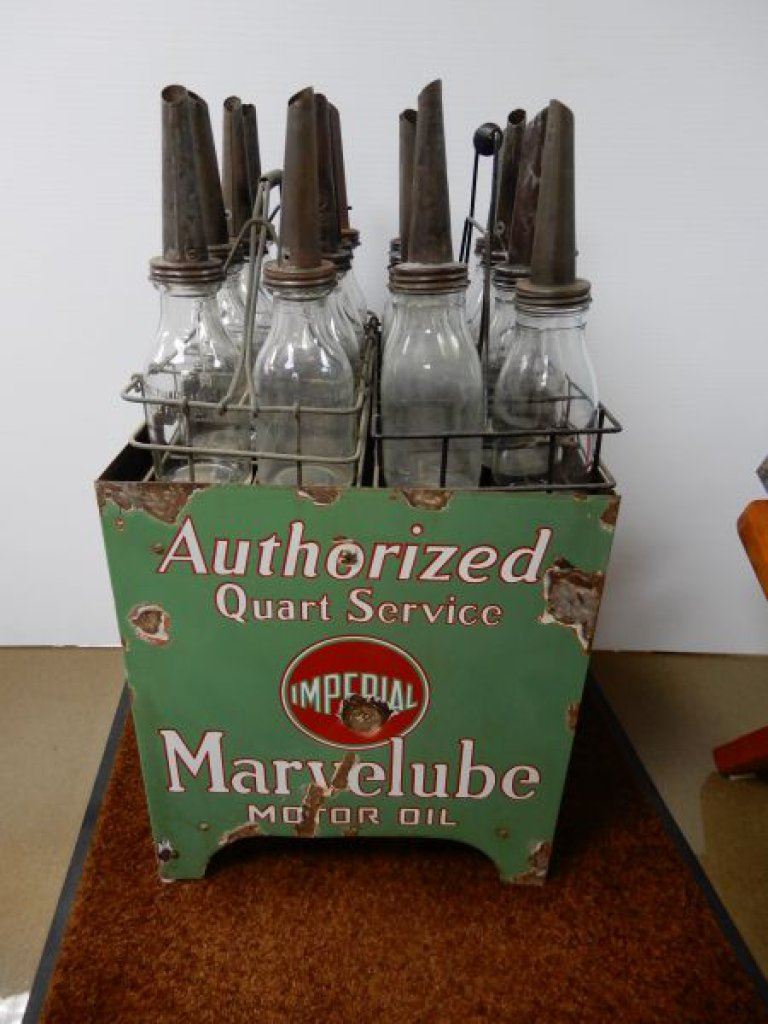 ORGINAL IMPERIAL MARVELUBE 16 OIL BOTTLE PORC RACK 20 1/4" X 20 1/4" X 36 1/2" - 2 WIRE 8 BOTTLE RACKS & BOTTLES & SPOUT LOCATION: LOWER LEFT