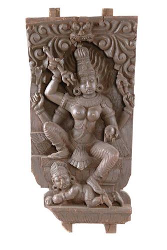ORIENTAL CARVED PANEL. Deeply carved panel depicts female warrior with spear sitting above a reclining and vanquished opponent. Carving appears to be from Thailand. SIZE: 31” x 15-1/2”. CONDITION: Some minor splitting and signs of rot on the back, otherwise good. 5-71797-1134