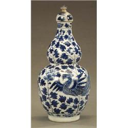 A Chinese double gourd shaped vase and cover, painted with phoenix and chrysanthemums in blue, 7in high, Kangxi (2)