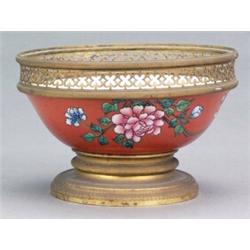 A Chinese 'famille rose' bowl, painted with chrysanthemum sprays on an iron red ground, gilt metal base and pierced rim, 7in diam