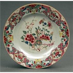 A Chinese 'famille rose' plate, painted with prunus and chrysanthemums, the shaped pink border also with flowers, 9in diam, Qianlong
