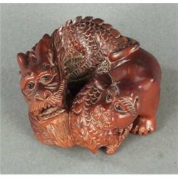 A Japanese carved hardwood netsuke, as a dragon and water hog, signed, 2in diam, 20th century