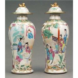 A pair of Canton 'famille rose' inverted baluster vases and covers, painted with figures on a balcony in panels, the ground with flowers and butterflies, 11in high, 19th century (one cover damaged) (4)