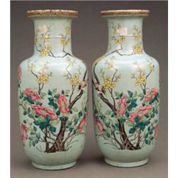 ORIENTAL CERAMICS AND WORKS OF ART - A pair of Chinese baluster vases, painted in 'famille rose'...