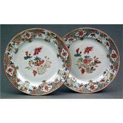 ORIENTAL CERAMICS AND WORKS OF ART - A pair of Chinese 'famille rose' plates, painted with peoni...
