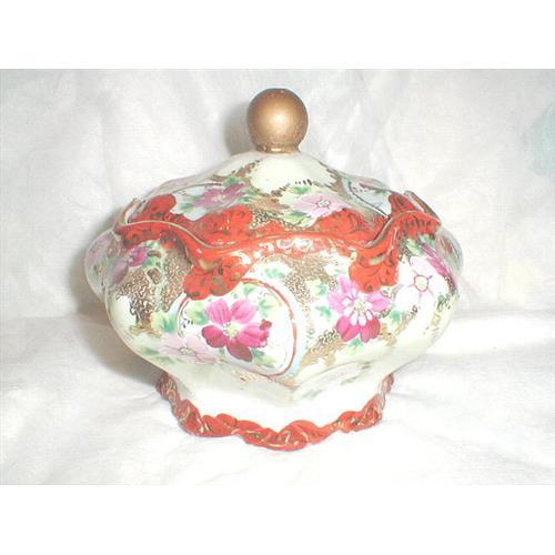 HERE IS A BEAUTIFUL ORIENTAL CRACKER JAR THAT IS SIGNED. THIS CRACKER JAR MEASURES 6 1/2 IN. TALL WITH THE COVER ON AND 7 1/2 IN. IN DIAMETER AND IS IN VERY GOOD CONDITION WITH NO CHIPS, CRACKS OR REPAIRS. <P> THIS CRACKER JAR HAS LOVELY COLORS OF CRIMSON, PINK, ROSE, BLUE AND GREEN ON A WHITE PORCELAIN BACKGROUND WITH GOLD THROUGHOUT.