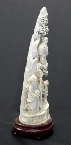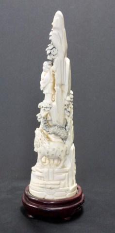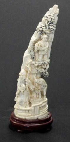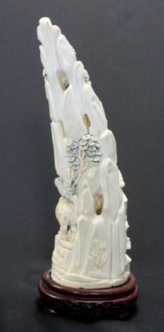 Very ornately carved. Depicts a tree with wise man and reindeer. Has wooden base 11 1/2" height.