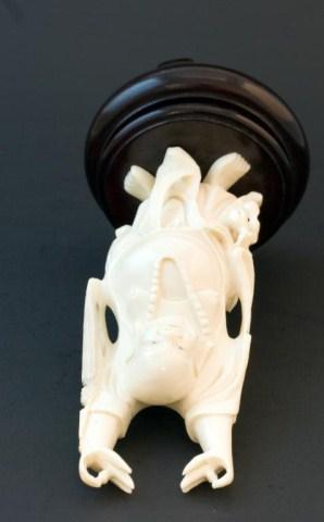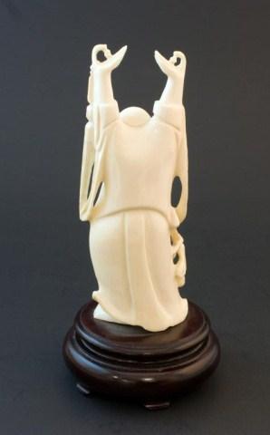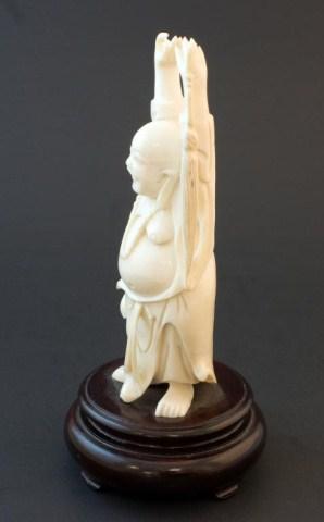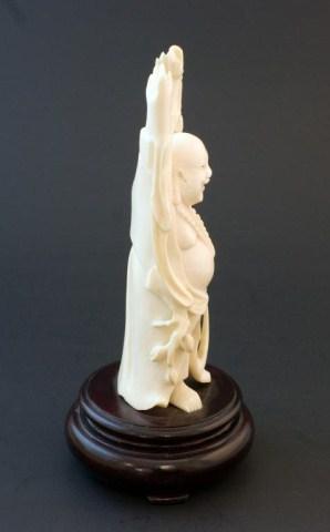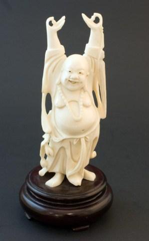 Depicts Buddha standing with his hands above his head. He appears happy. Has a teakwood base. Measures 5" height + 1 1/4" base.