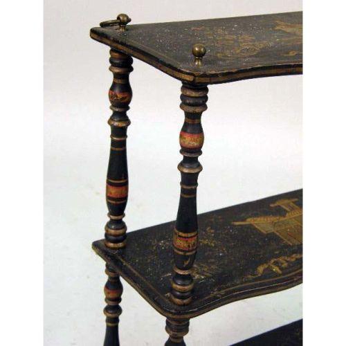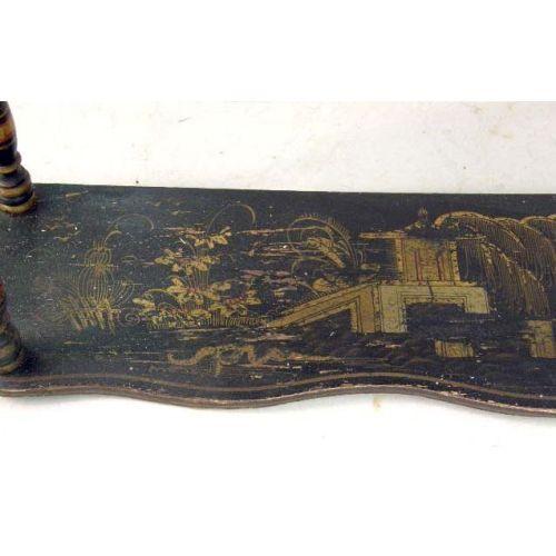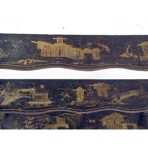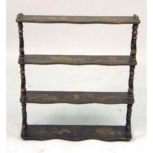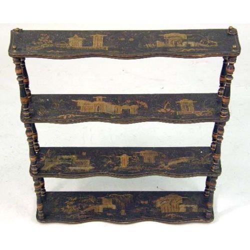ORIENTAL LACQUER CHINOISERIE DECORATED DISPLAY SHELVES<BR><BR>With gilt landscapes and pagodas, 28"h x 25-3/4"w