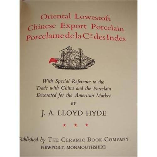 J.A. LLOYD HYDE. ORIENTAL LOWESTOFT CHINESE EXPORT PORCELAIN. Published by The Ceramic Book Company. Newport,Monmouthshire. Special Reference to the Trade with China and the Porcelain Decorated for the American Market. 161 Pages with Color Frontpiece OF a Famille Rose Goose Tureen and Cover. This Edition contains thirty-three plates in monochrome and four in Full Color. This particular book is in a orange hard cover in Good Condition that is a Third Edition which was limited to 1000 copies in 1964.