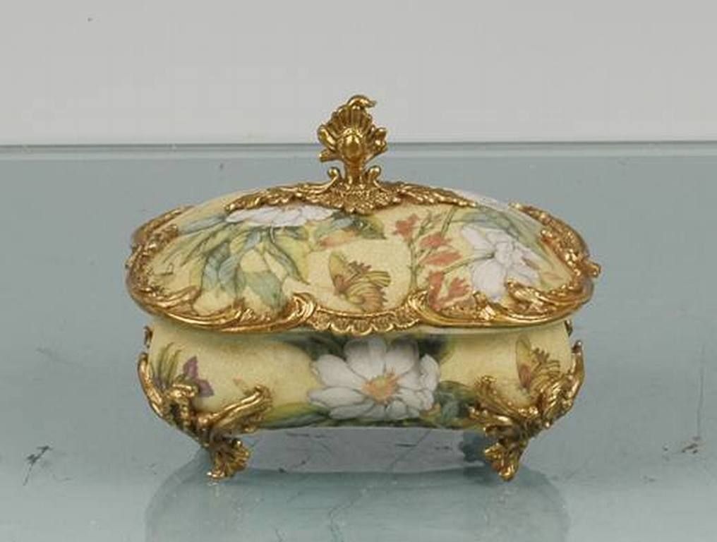 ORIENTAL FINE PORCELAIN LIDDED BOX - HAND PAINTED FLORAL AND BUTTERFLIES - CARVED BRASS HANDLES, BASE AND TRIM