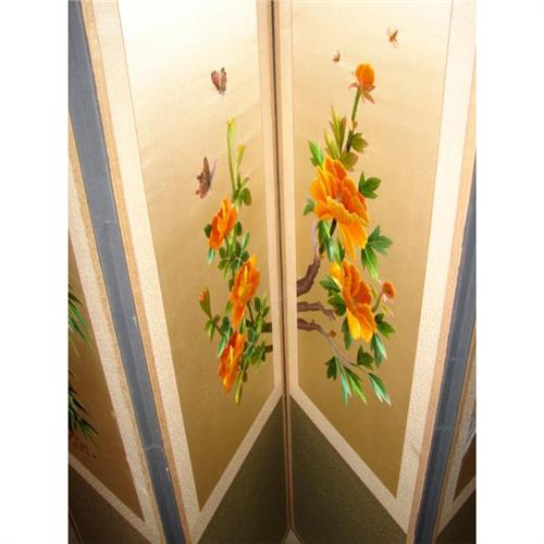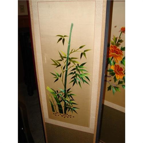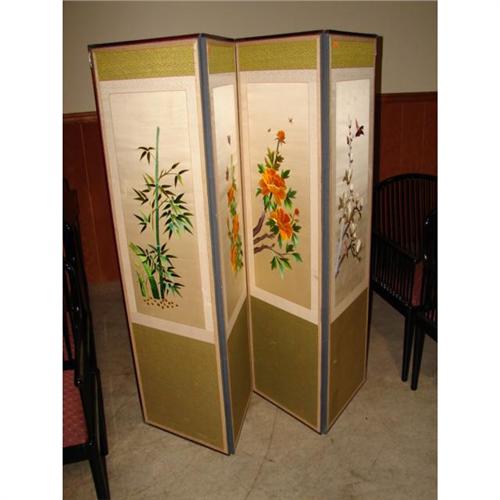 ORIENTAL FOUR SECTION SCREEN. Silk floral, butterfly, & bird decorations at sections. Teakwood section frames. 64” H, Each section: 18.5” W