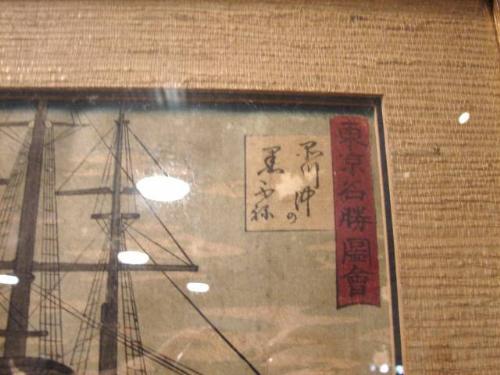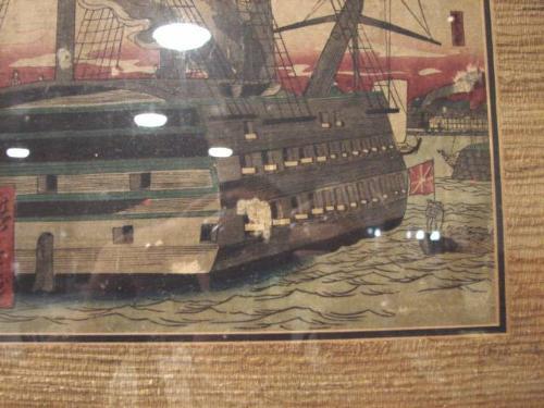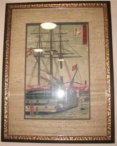 ORIENTAL WOODBLOCK PRINT OF SHIP. Marked "Woodblock Print/Yokohoma School of Art" on verso. Shows minor signs of damage. 15" x 19" framed.
