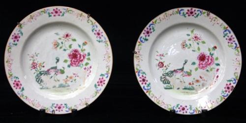 1 PAR TALLRIKAR, DEKOR AV FÅGLAR OCH PIONER, FAMILLE ROSE, KINA 1700-TAL, D23 (SMÅ KANTNAGG PÅ BAKSIDAN) (2)