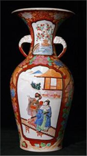 GOLVURNA, BUKIG FORM, UTSVÄNGD MYNNING, DEKOR AV FIGURER I RELIEF, POLYKROM PIONDEKOR, IMARI, JAPAN TIDIGT 1900-TAL, H55