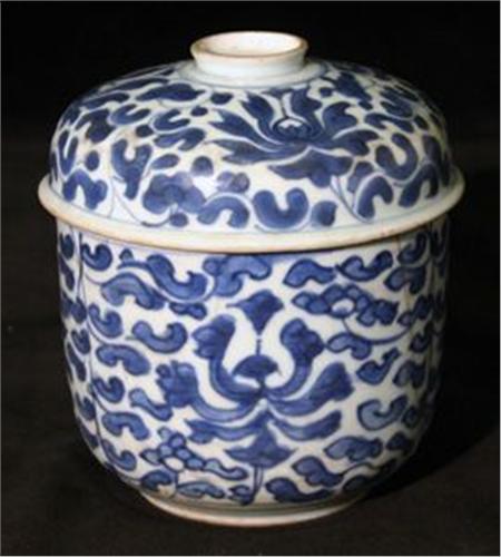 BURK MED LOCK, BLÅVIT UNDERGLASYRDEKOR, KINA 16/ 1700-TAL, H14 (NAGGAR, SPRICKOR)