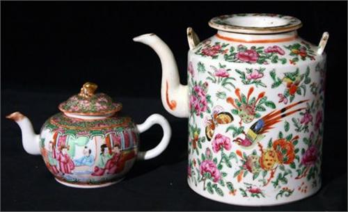 2 TEKANNOR, POLYKROM BLOM OCH LANDSKAPSDEKOR, KANTON, KINA C. 1900, H10,18 (2)