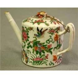 TEKANNA, RAK PIP, FLÄTAT HANDTAG, POLYKROM FÅGEL- OCH BLOMSTERDEKOR, KANTON, KINA, 1800-TALETS MITT, H11