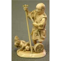 FIGURIN, ELFENBEN, MAN MED APA, JAPAN, 1800-TALETS SENARE DEL, H9 (STAV MED SKADA)