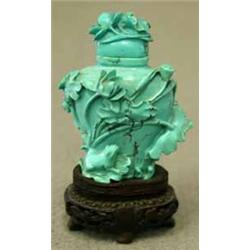SNUSFLASKA, TURKOS STEN, PÅ TRÄSOCKEL, SKUREN DEKOR AV GRODA I BLADVERK, 18/1900-TAL, H7