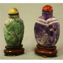 2 SNUSFLASKOR, EN GRÖN STEN, EN BLÅ STEN, SKUREN RELIEFDEKOR, TRÄSOCKLAR, KINA, 18/1900-TAL, H7+8