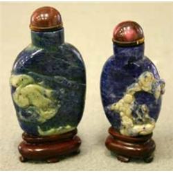 2 SNUSFLASKOR, BLÅ OCH LILA STEN SKUREN, RELIEFDEKOR, TRÄSOCKLAR, KINA, 18/1900-TAL, H8+9