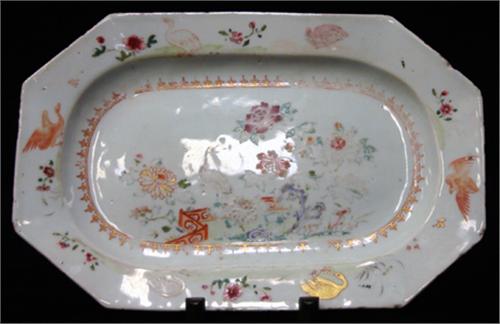 FAT, REKTANGULÄRT, SVÄNGDA HÖRN, DEKOR AV FÅGLAR OCH BLOMMOR, FAMILLE ROSE, KINA 1700-TAL, B28, D19 (GLASYRNAGG, SLITEN DEKOR)