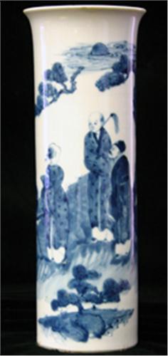 VAS, CYLINDERFORMAD, BLÅVIT UNDERGLASYRDEKOR AV FIGURER I LANDSKAP, BOTTENMÄRKE, KINA 1800-TAL, H31
