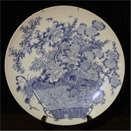 PRAKTFAT, BLÅVIT UNDERGLASYRDEKOR AV PIONER I KORG, BOTTENMÄRKE, JAPAN 1800-TAL, D55