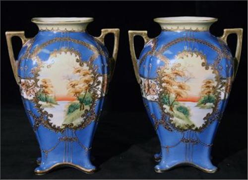 1 PAR VASER, BALUSTERFORMADE, RAKA HÄNKLAR, POLYKROM BLOMSTERDEKOR, GULDBLAD DEKOR I RELIEF, NIPPON, JAPAN TIDIGT 1900-TAL, H24