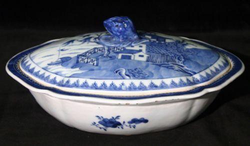 TERRIN MED LOCK, OVAL, VÅGIG FORM, BLÅVIT UNDERGLASYRDEKOR AV BLOMMOR, HUS OCH BÅT, LÖKFORMAD LOCKKNOPP, KINA C. 1800, H12, B30, D24