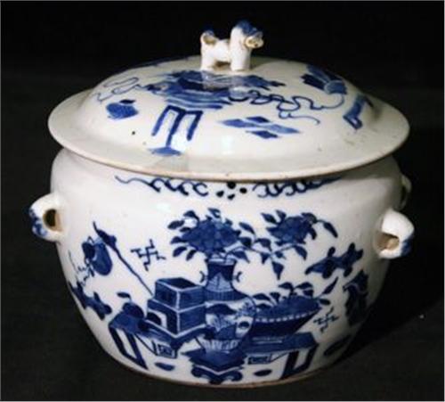 TERRIN MED LOCK, BLÅVIT UNDERGLASYRDEKOR, KINA 1800-TAL, H13, D15 (LOCKET MED KANTLAGNING)