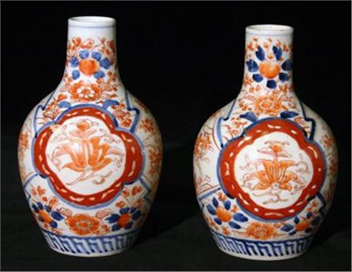 1 PAR VASER, BALUSTERFORMADE, DEKOR AV BLOMMOR I BLÅTT OCH RÖTT, IMARI, JAPAN 1800-TALETS SENARE DEL, H20(EN MED BOTTENRINGSNAGG) (2)