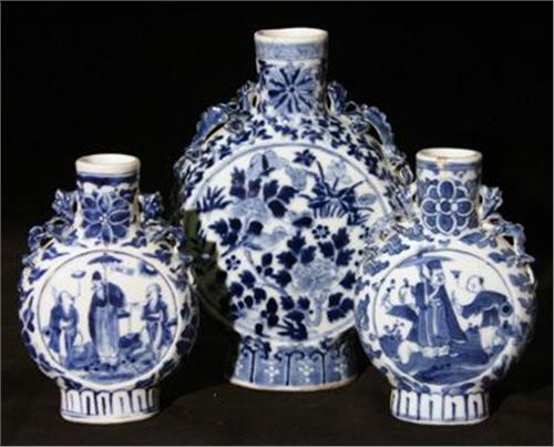 3 PILGRIMSKRUS, EN STÖRRE MED BLÅVIT UNDERGLASYRDEKOR AV FÅGLAR OCH BLOMMOR, H21 (MYNNING MED KONSTLAGNING), 2 MINDRE MED FIGURDEKOR, H15 (NAGG OCH KANTSPRICKA)(3)