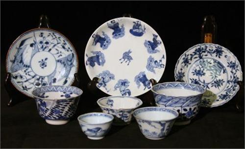 3 FAT, 5 RISKOPPAR, BLÅVIT UNDERGLASYRDEKOR, KINA 1700, 1800-TAL (NAGGAR) (8)