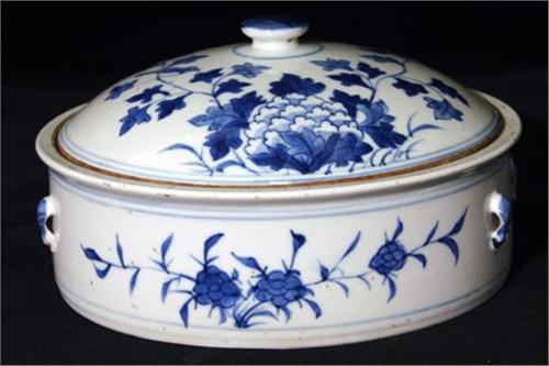 TERRIN MED LOCK, RUND, BLÅVIT UNDERGLASYRDEKOR, KINA 1800-TAL, H11, D24 (NAGGAR)