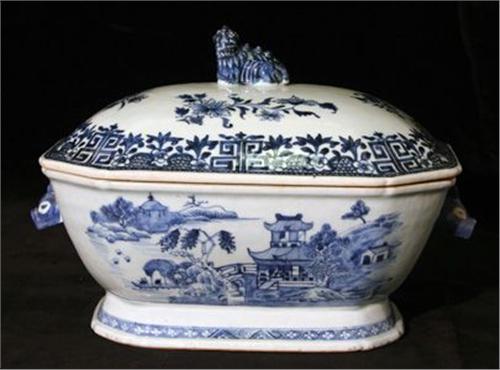 TERRIN, BLÅVIT UNDERGLASYRDEKOR AV HUS OCH TRÄD, HÄNKLAR I FORM AV KANINER, LEJONFORMAD LOCKKNOPP, KINA 1700-TALETS SENARE DEL, H23, B37 (ETT ÖRA KONSTLAGAT, LOCK EJ TILLHÖRANDE)