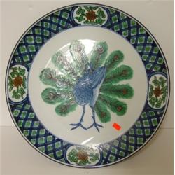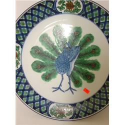ORIENTALIA WALL CHARGER WITH PEACOCK DECORATION. Marked on reverse with Oriental marking and decorated with blue peacock on front. Good condition. 16" Dia.