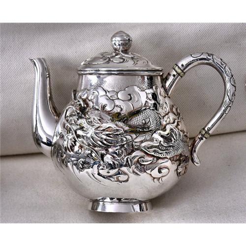 AN ORIGINAL 19TH CENTURY SIGNED STERLING SILVER DRAGON TEA SET<p>A magnificent and rare original 19th century sterling silver dragon tea set, including a teapot with original lid, a sugar with original lid, and a creamer. The body of each piece is encircled by a dragon in high relief amidst swirling clouds in lower relief. All dragons and designs in the silver are hand chased. The knobs on top of the teapot and sugar represent the pearl of wisdom. The teapot is approximately six inches in height and seven inches from the tip of the spout to the outer point of the handle. The creamer is double-walled in silver. The interior of the teapot has a permanently affixed silver filter for tea leaves. Each of the three pieces bears an incised seal by the artist. This set was created in the late 1800's. Condition is excellent. <p>THE DRAGON IN JAPANESE ART - The dragon in Japan is an ancient symbol of power, heavenly knowledge and imperial strength. "Have you seen the dragon?" asks Mr. Okakura in The Awakening of Japan. "Approach him cautiously, for no mortal can survive the sight of his entire body. The eastern dragon is not the gruesome monster of medieval imagination, but the genius of strength and goodness. He is the spirit of change, therefore of life itself. . . . Hidden in the caverns of inaccessible mountains, or coiled in the unfathomed depths of the sea, he awaits the time when he slowly arouses ...