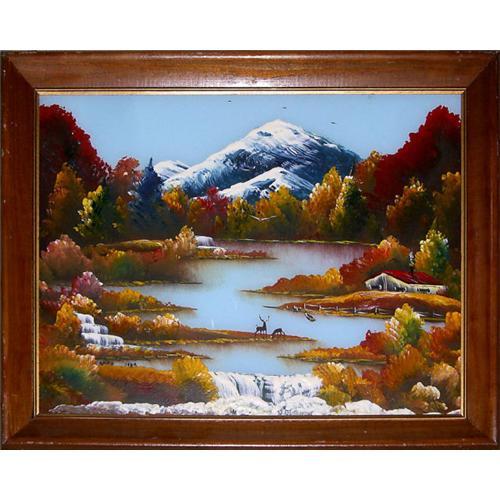 AN ORIGINAL PAINTING ON GLASS OF A MOUNTAIN AND NATURESCAPE<p> A lovely autumn naturescape in the far north of America. Snow-capped mountains lie in the distance of this nature scene, whose central focus is a large, tranquil lake dotted by small waterfalls. A country house with a red roof sits on the far right, with a decaying wood fence surrounding the homestead. A rowboat sits docked nearby. A large deer and his mate stand on one of the fingers of land that juts out into the lake, the male alert to danger while the female eats grass. A series of cascading waterfalls leads the viewer to a central fall which crashes into foaming whitecaps in the immediate foreground of the scene. Trees in all their autumn splendour of reds, browns, and yellows completely surround the lake. The calm blue of the lake, as well as the sky, is beautifully enhanced by the glass canvas used for this painting. <p>The entire painting is done on glass with special pigments, and the artist has signed and dated this work at the lower left, 'Ralph, 1983'. The reverse of the painting also bears the artist's signature, 'Ralph Kaufman'. Overall dimensions are 18.3" wide by 14.25" high, and this piece is in excellent condition considering its quarter century age, with only minor blemishes to the wood frame.