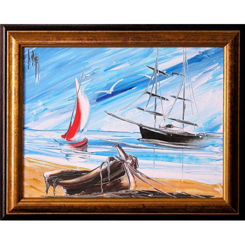 A two-masted schooner is anchored offshore, a smaller boat with a single red and white sail waits a little closer to shore, and a rowboat sits on the beach. Seagulls fly overhead in an impressionistic sky of blues and whites. <p>The artist's signature appears at the upper left of the painting. Dimensions are 29.6 inches wide by 23.5 inches high, and condition is excellent. The painting is surrounded by an attractive, mostly rounded, thick gilt solid wood frame with dark brown outer border. The artist is reportedly from Spain, but living in Miami, Florida.