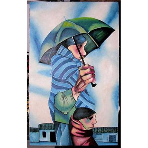 A charming portrait painting in dominant colors of blue and green of a mother carrying an umbrella, walking down a quiet street in the Ecuadorian countryside. Tiled-roof one-story buildings can be seen against the sky in the background. The mother is beautifully portrayed by the artist with a somewhat sad and weary expression on her face, perhaps the result of a hard life and manual toil. She is wrapped in a blue striped shawl, and her child is likewise wrapped in a burgundy shawl in the style of the native people of Ecuador. She carries a green umbrella in her right hand, providing shelter for herself and her child. <p>This unusual painting is signed at the lower left by the Ecuadorian artist Cordova, and dated, '83'. It is 39.6" high by 23.75" wide, and is in excellent condition. It is unframed, but stretched on wood.