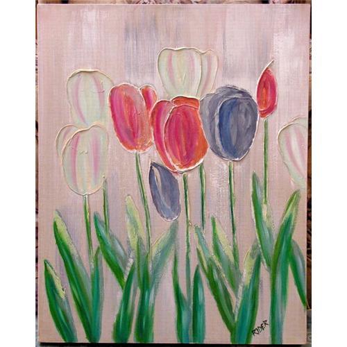 <p>An attractive original painting of nine red, white and blue tulips in a soft color palette, painted in an impressionistic style with some impasto technique. The artist's signature appears at the lower right, 'Rider'. The painting is gallery-wrapped (canvas stretched around to the back of the wooden frame), and can be hung as is, or framed. The dimensions are 30" in height by 23.6" in width, and the condition is excellent.