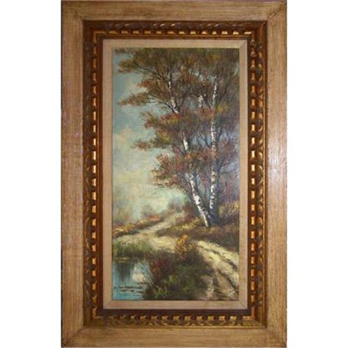 AN ORIGINAL LANDSCAPE OIL PAINTING OF BIRCH TREES IN AUTUMN<p>A classic landscape in the romantic style, showing a double birch tree in autumn. The lovely colors of the fall foliage on the trees grace the bank of a pond in this peaceful landscape scene in a natural color palette. The painting is signed at the bottom by the artist, 'B. Leyndert'. It was created circa 1960. The outer section of the wood frame shows some wear due to age, while the inner section is carved and gilt with a thin cloth mat. Dimensions are 32" high by 20" wide. Condition is very good, considering the age of this painting.