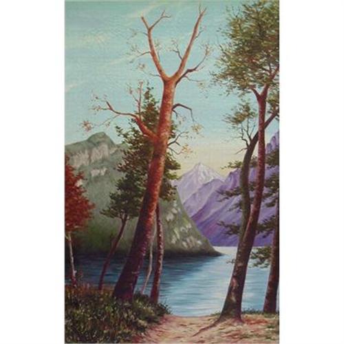 ORIGINAL LANDSCAPE OIL PAINTING OF A WILDERNESS SCENE<P>An attractive and serene landscape painting in oils of a wilderness area, with a tree-lined path leading to a calm lake surrounded by mountains in a soft, natural color palette. <p>Framed in stained oak, this painting was probably done circa the first half of the 20th century. Signed 'P. Horbach' at the lower left. Overall condition is good, but note that there is some cracking of the oil paint due to age and dry conditions in the sky area. Additional photos are available upon request.