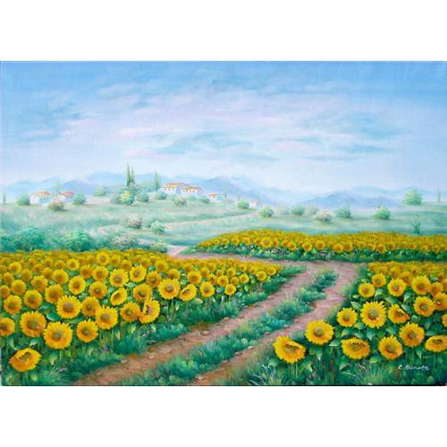 AN ORIGINAL LARGE OIL PAINTING OF A SUNFLOWER FIELD IN ITALY <P>A charming and large landscape painting in oils of a sunflower field in the country. The cloud-filled sky softly glows with pastel hues of blue, lavender and white. Beyond the sunflowers a grouping of buildings is visible, perhaps the farm, guest, and workers' houses, with random trees, including a group of Italian cypress, scattered about the landscape. In the distance is a mountain range. The collector from whom this painting was purchased informed us she acquired the work in Ocean City, Maryland, and that the artist painted this sunflower field when he was visiting Italy. <p>Dimensions are nearly 4 feet wide by 3 feet high (45" by 33"). The artist has signed this work at the lower right corner, 'C. Benolt'. The painting is unframed but stretched on wood, and its condition is excellent