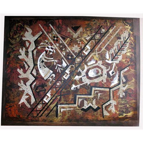 A highly decorative, interesting and attractive mixed media painting in a stylized abstract American Indian theme. The basic color scheme is varying shades of browns, blacks, off-whites and gold leaf. The painting is gallery-wrapped around the edges, and though unframed, can be hung on a wall as is. Dimensions are quite large at 5 feet by 4 feet, and the piece is signed at lower right by the artist, 'Cris Allison'. Condition is excellent. Additional photos are available upon request.