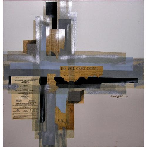 A sophisticated and attractive mixed media painting by listed artist Patrick McNurney. The painting is reported to have been created specifically for the Wall Street broker who then purchased it, subsequently selling it to this gallery. Actual pages from issues of the Wall Street Journal are incorporated into this painting and are dated 1985. They are integrated into a striking and bold abstract geometric design with a color palette of grays, silver, charcoal and light blue on a very light gray ground. The design itself almost gives the viewer the feeling of Wall Street skyscrapers.Signed by the artist at the center right, this large painting is in excellent condition and is gallery wrapped to be hung as is, perfect for a stock broker's home or office. Dimensions are 36" by 36".